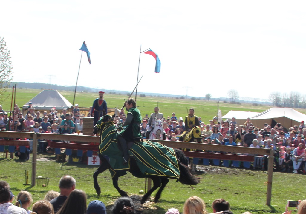 Die Ritter – ganz im Stil des Mittelalters – geben mit ihren Fähigkeiten an und das Publikum klatscht oder buht – je nach Ausgang der einzelnen Aufgaben. Eine durchaus gelungene Show, nicht nur für die Kinder. Und es laufen mittelalterliche Figuren durch das Gelände – zum Teil in vollen Montur.